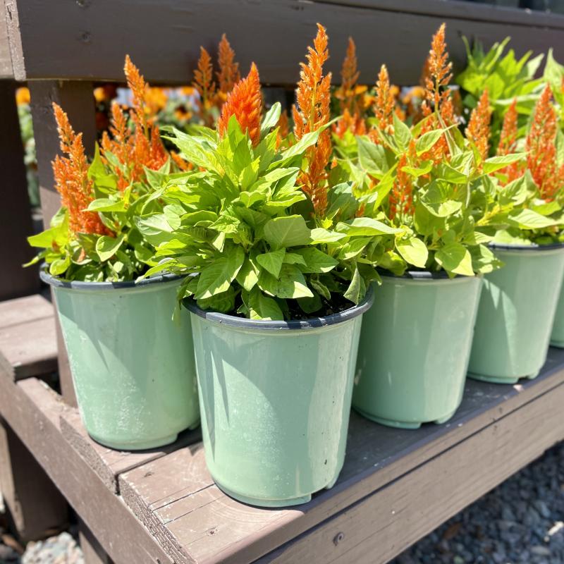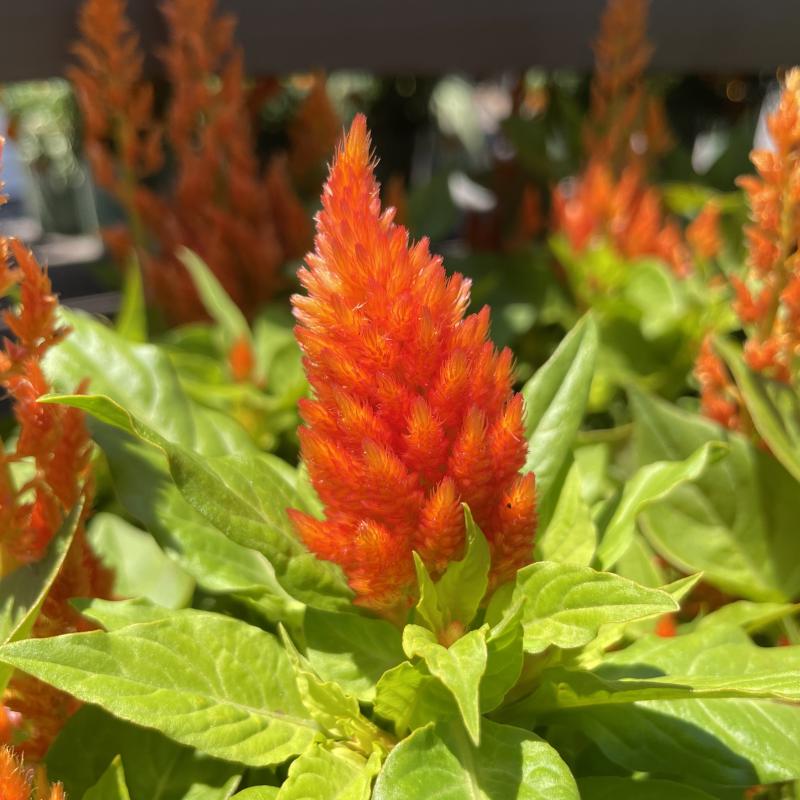 Vibrant orange flower spikes (is anyone else getting Cheeto vibes?) stand above lime green foliage, making it an instant focal point in container gardens and annual garden beds. It thrives in heat and humidity. Prune spent blooms to encourage more.
