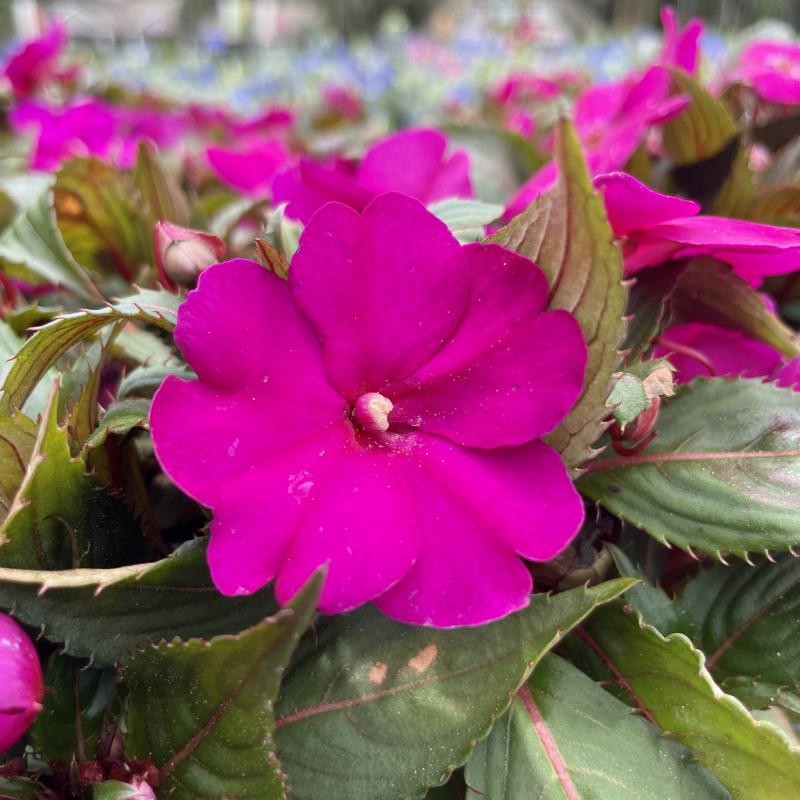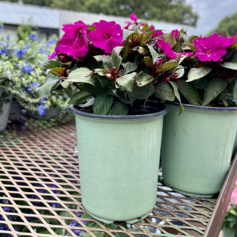 A profusion of large colorful flowers blanket the dark green leaves on this perennial plant. Sunpatiens can stand up to sun better than other varieties, but we still only recommend part-sun.