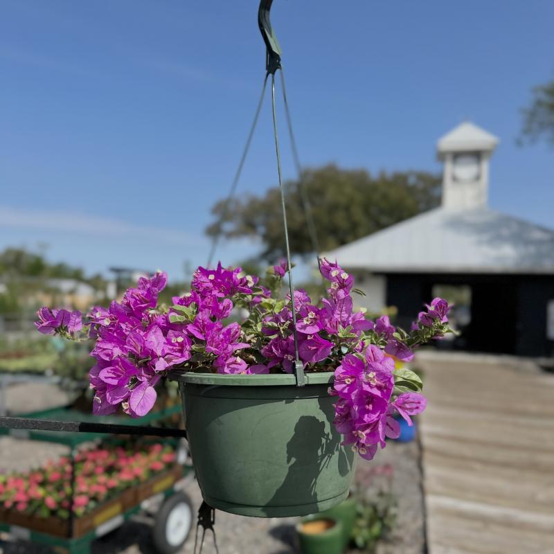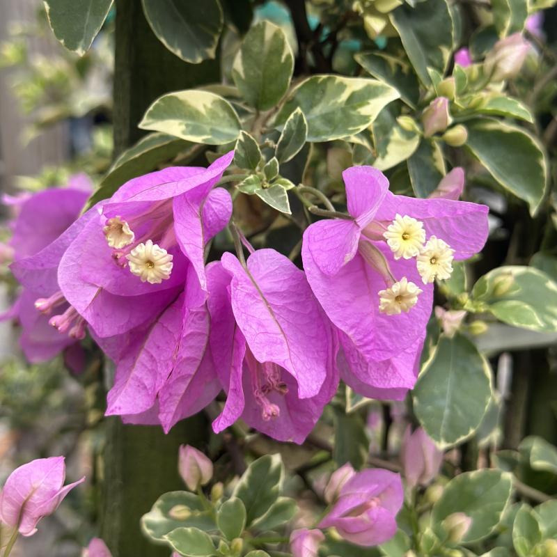 Compact and perfect for small, sunny spaces. Cascading masses of lavender-blue flower-like bracts are offset by variegated green and white foliage.