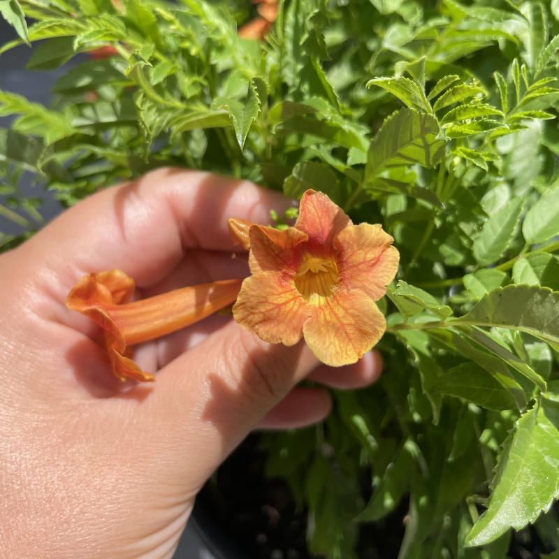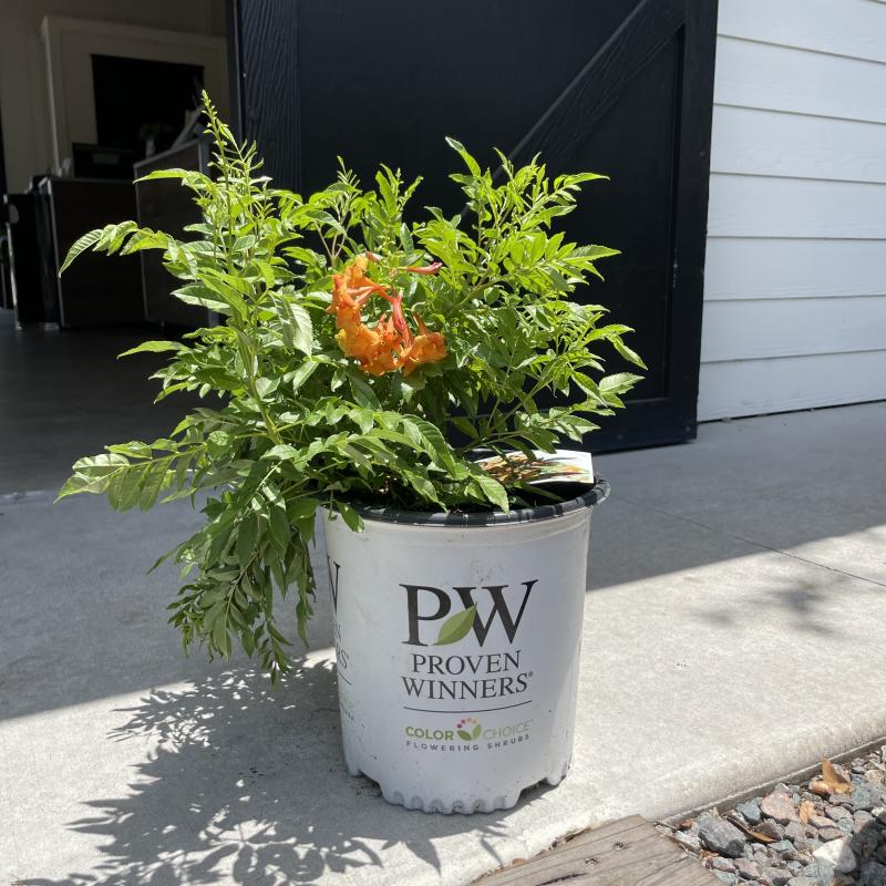If you love trumpet vine but don't have the space, this is the shrub for you. Fragrant, burnt orange flowers cover this deciduous, compact shrub all summer long. The tubular, nectar-rich blooms are perfect for attracting hummingbirds and butterflies. Use as a thriller in a container garden or plant near a patio to enjoy the light, floral scent. Once established, they're very heat and drought tolerant.