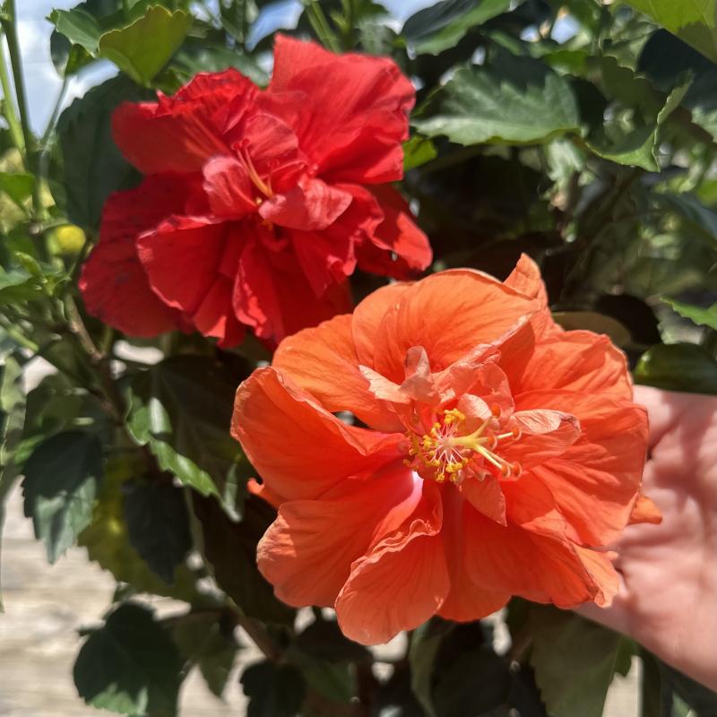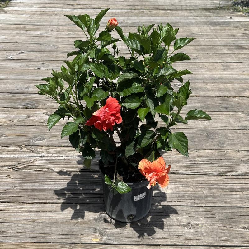 Double the fun with this combo pot of Peach and Red Hibiscus! Gorgeous in a sunny garden.