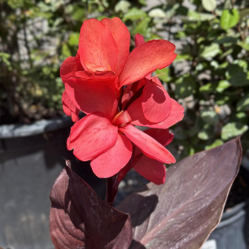 This heat-tolerant Canna lily produces big salmon blooms above dark red foliage. Blooms spring through summer.