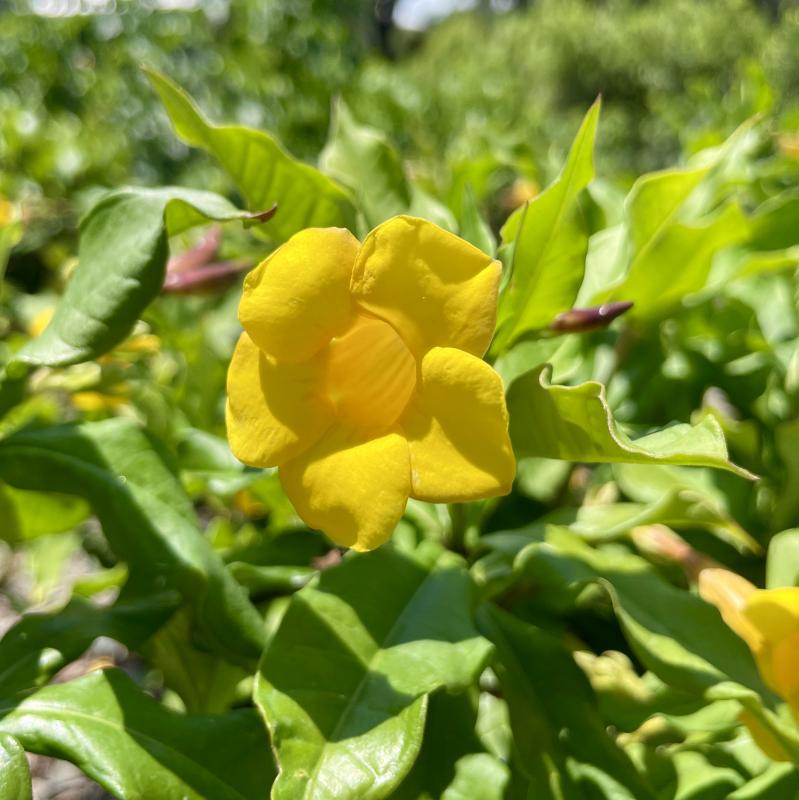Golden trumpet-shaped flowers appear from Spring to Fall above the deep green foliage of this tropical shrub.