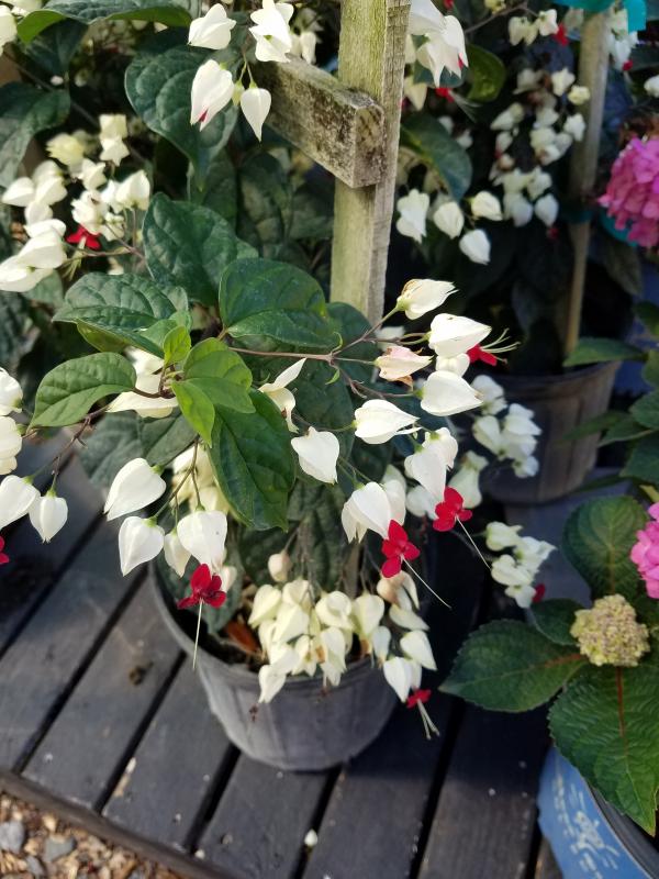White flowers with red centers give this plant its name. An easy flowering vine for shady areas that requires little care once planted.
