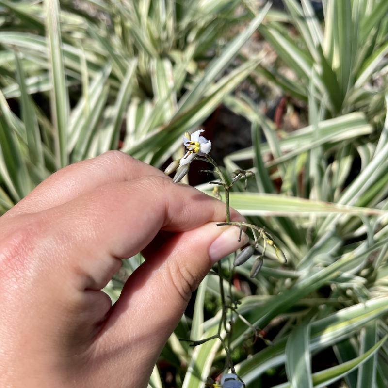 Small blue flowers stand above lush variegated foliage adding texture and color to a landscape.