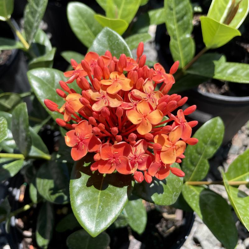 Lush, tropical foliage is covered with clusters of reddish-orange flowers from spring to fall, creating a colorful hedge or stand-alone shrub.