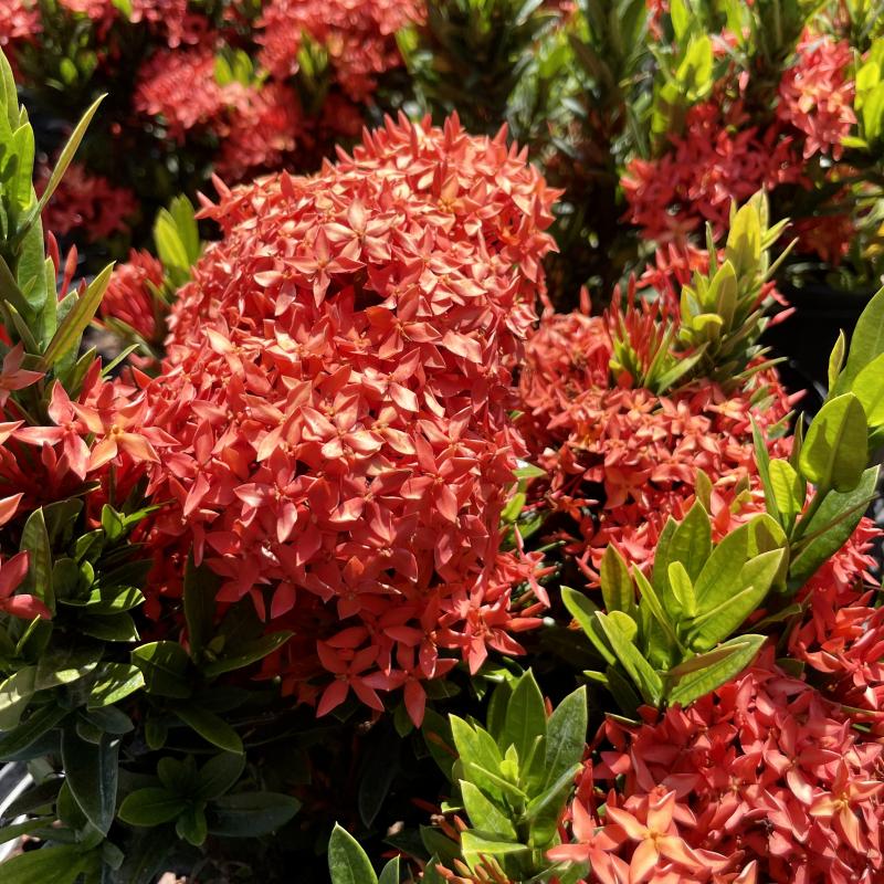 Lush, tropical foliage is covered with clusters of reddish-orange flowers from spring to fall. Keep as an individual shrub or plant closer to form hedges.