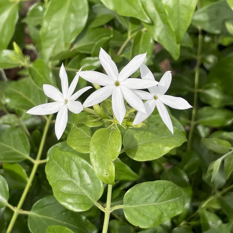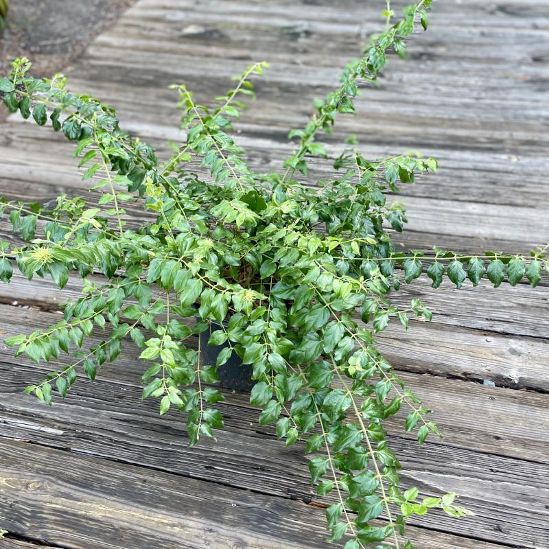 Clusters of white, pinwheel-like flowers are produced throughout the summer by this rounded, weeping, evergreen shrub.