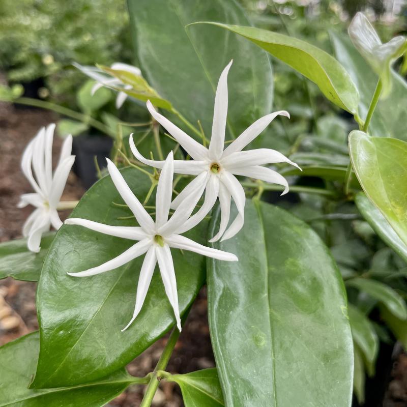 Clusters of fragrant white, pinwheel-like flowers are produced throughout the summer by this rounded, weeping, evergreen shrub.