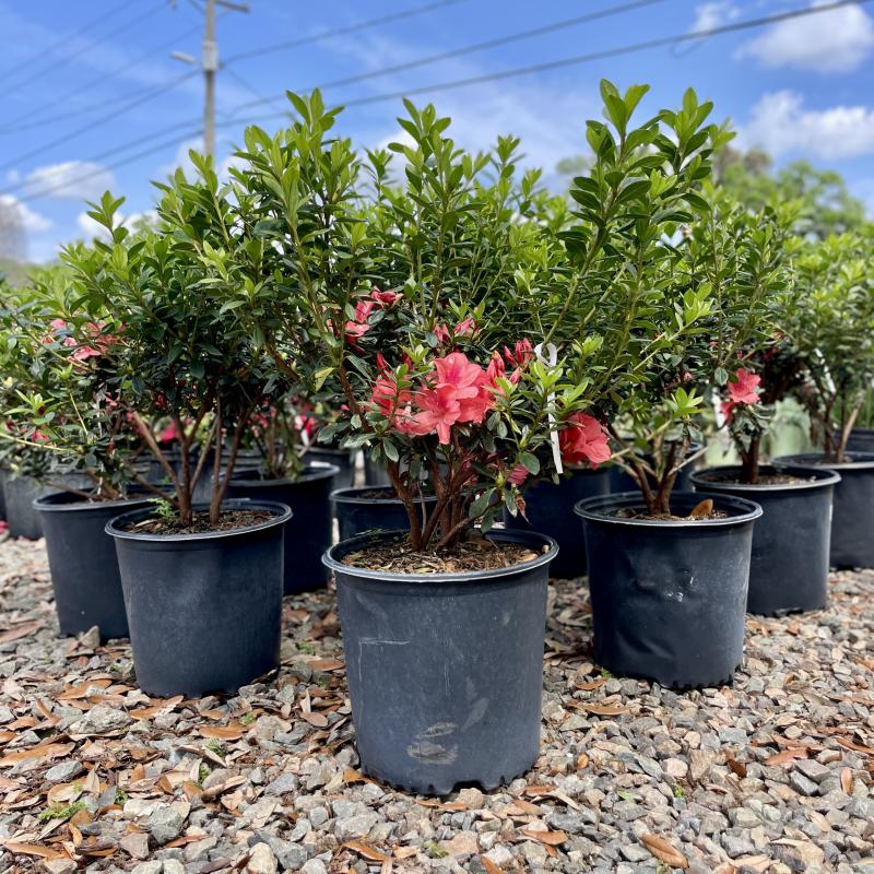 Bright orange-pink flowers brighten up the garden in spring on this semi-dwarf azalea. They're great under trees or as a foundation in shady areas. They thrive under shade trees in rich, acidic soil. Conduct light prunes throughout the year on leggy and expired branches, and hard prunes at the end of winter to encourage flowering.