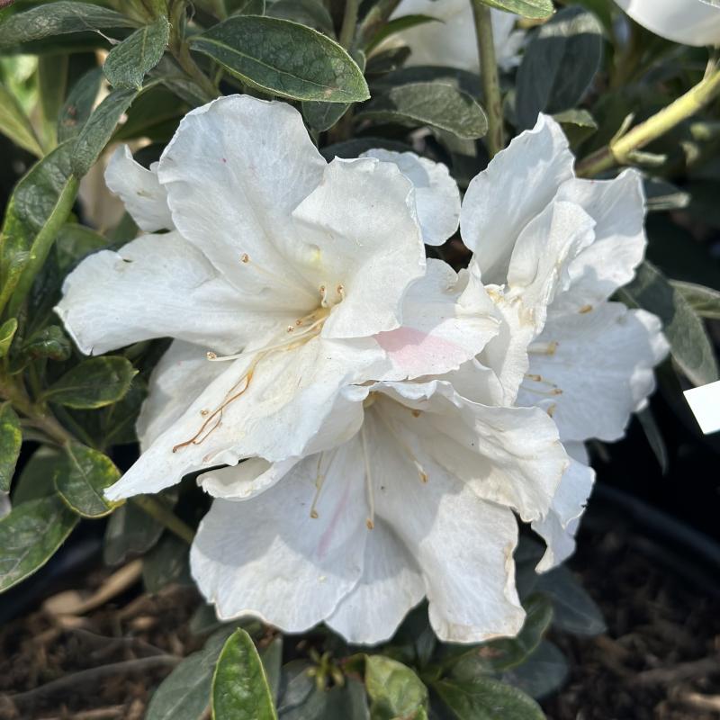 Pure-white double flowers cover this compact azalea in spring time. Plant with pink ruffles for a colorful display in shady areas.