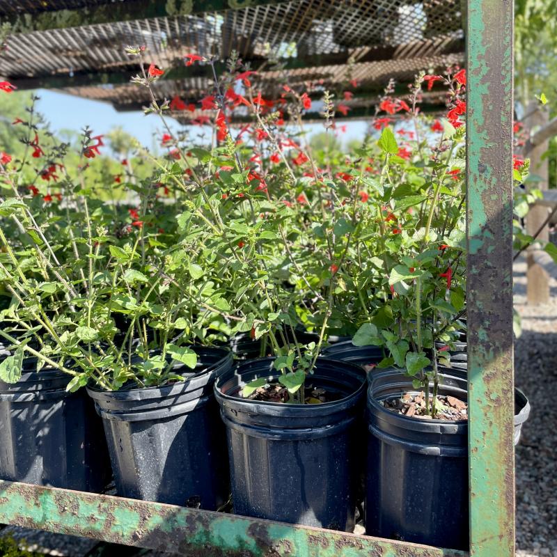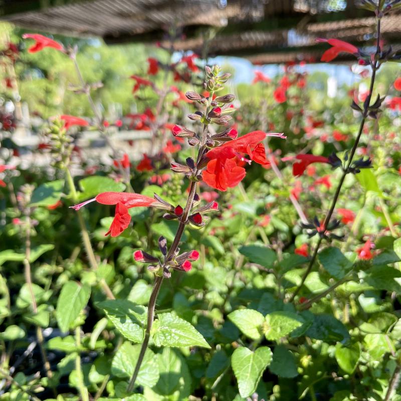 Bright red flower spikes bloom throughout the summer above the dense, dark green leaves of this gorgeous salvia.
