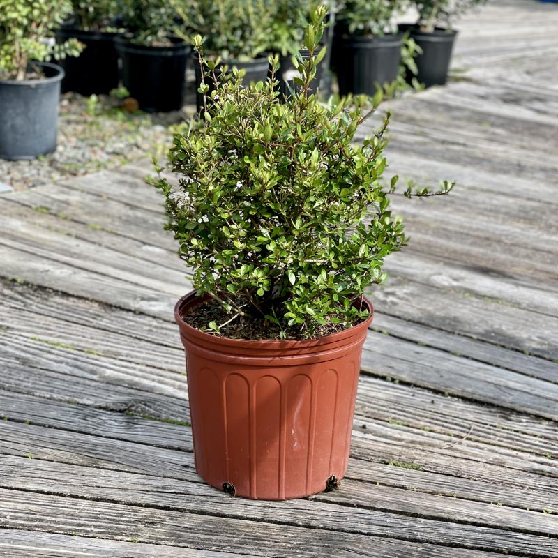 The dense green foliage of this easy Florida native gives way to clusters of white flowers in springtime. Prune the flowers once they expire to encourage new buds. Conduct light-pruning year-round and hard prunes in late winter/early spring.
