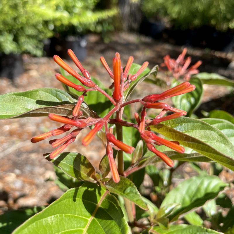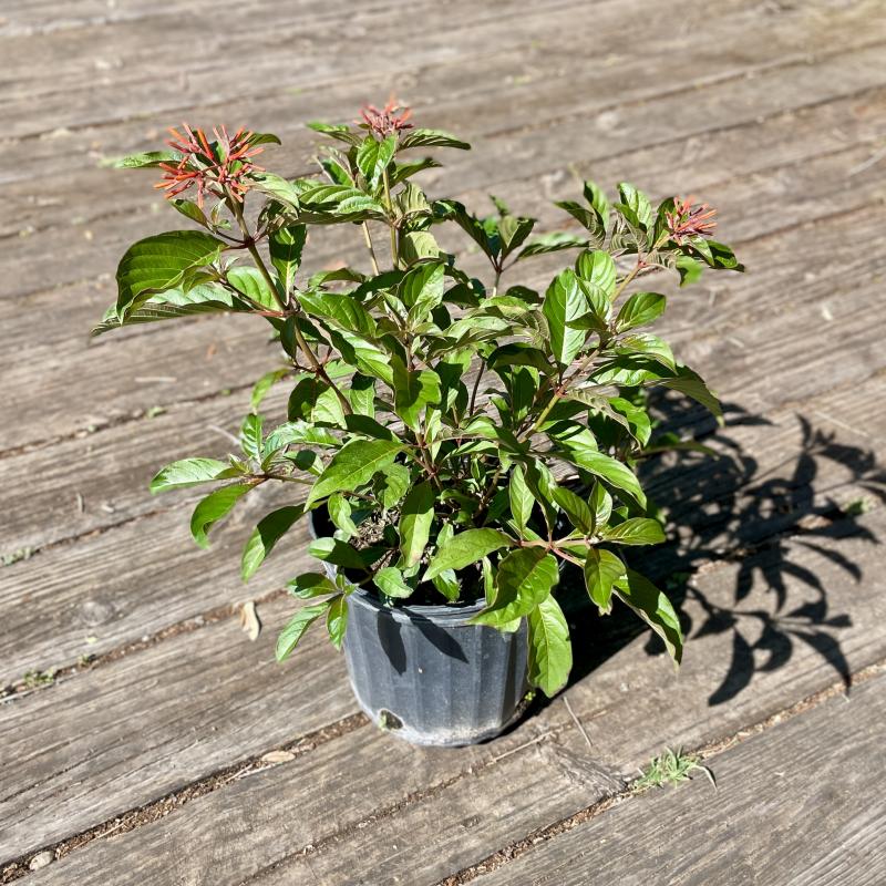 Green and red leaves create a bright, beautiful backdrop in a sunny landscape. Features tubular orange-yellow flowers from spring to fall. This is the Floirda native variety.