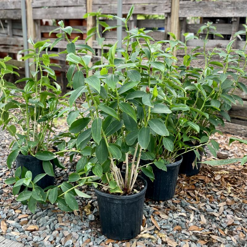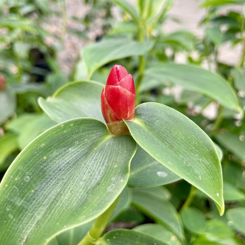 Tropical, red flowers are like little buttons amongst the lush foliage of this beautiful ginger. Great for shady gardens.