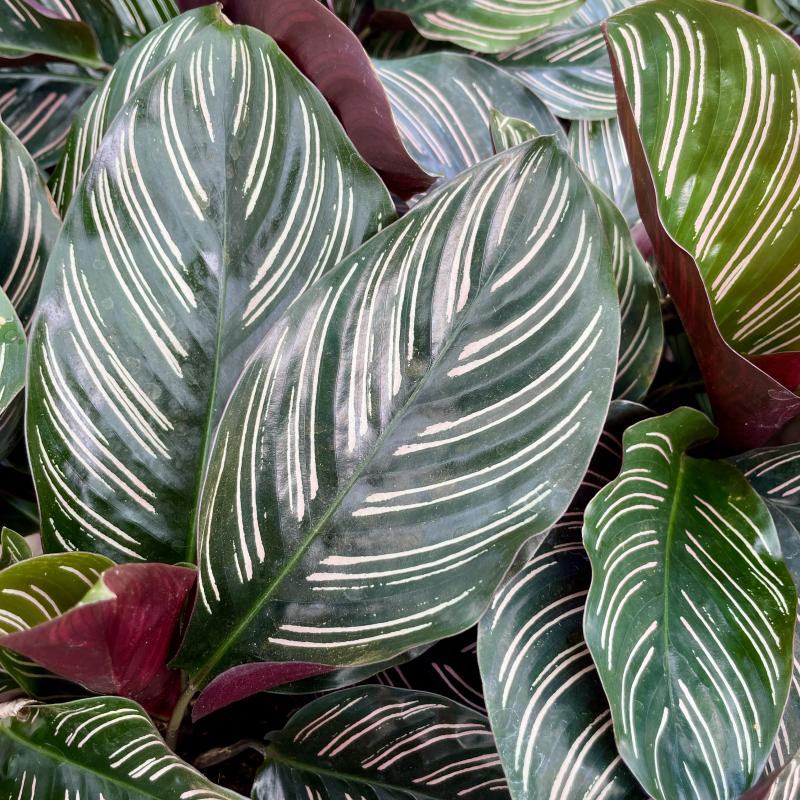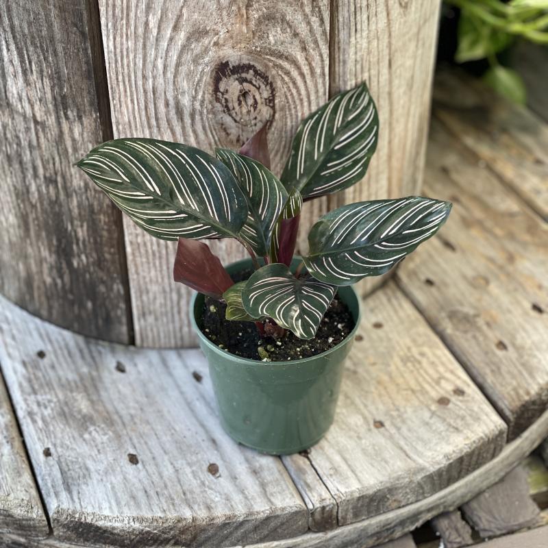Deeply colored leaves feature pink stripes and dark purple undersides. Leaves can get several inches wide and tall at full maturity. Keep in a more humid location to keep the leaves happy.