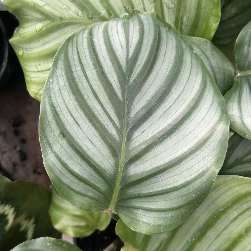 This calathea has large, vibrant green leaves decorated in dark green stripes. Keep the plant in a more humid location to prevent browning on the leaves. In its mature age, leaves can reach being over a foot wide!