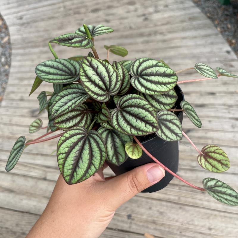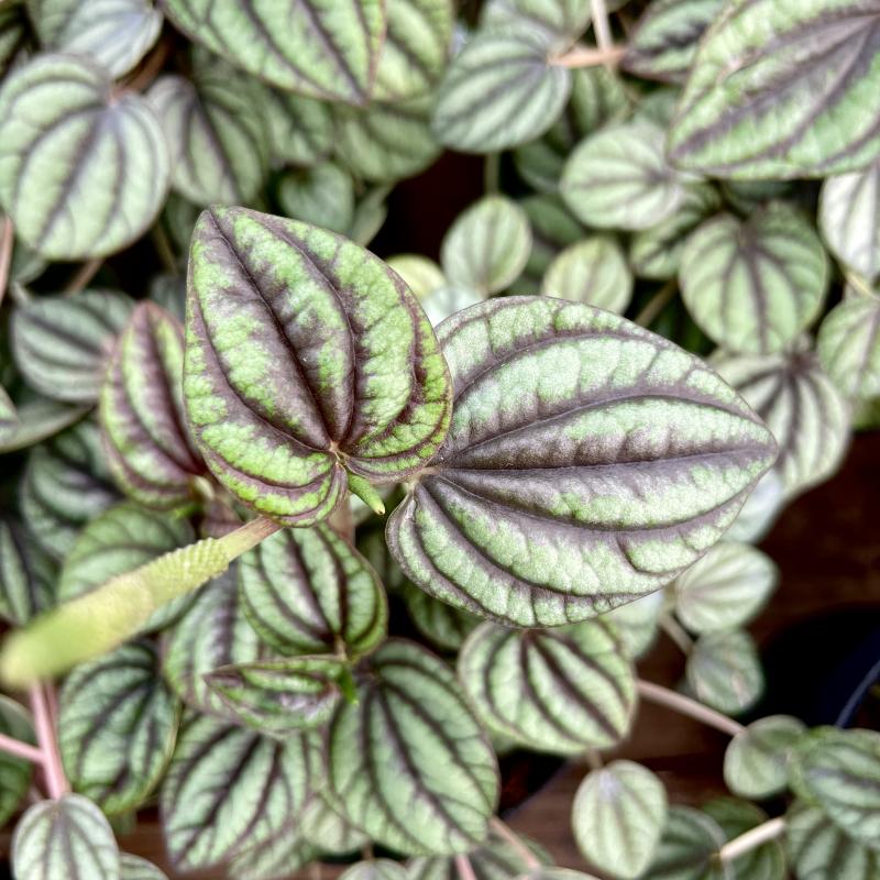 Silvery leaves with deep purple veins and red stems make for an interesting compact plant that's pet friendly.