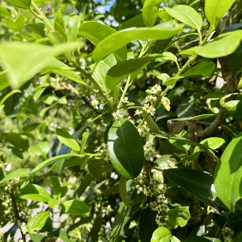 An upright, spreading evergreen shrub with dark green leaves, white flowers, and red berries. A beautiful medium-sized shade tree.