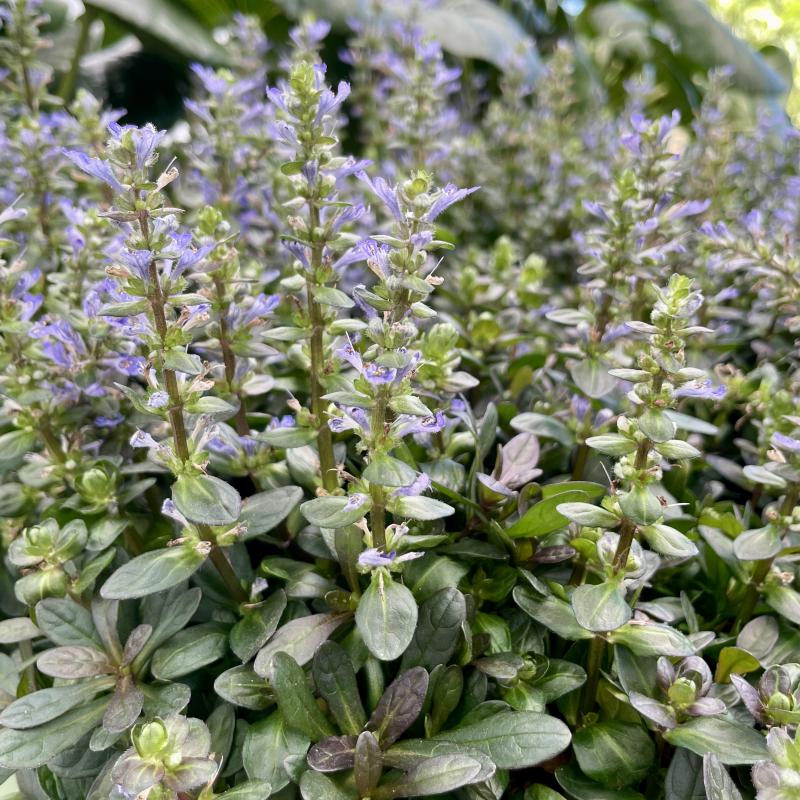 A hardy shade groundcover with chocolate purple leaves that fills in densely. Great for between stepping stones. Lovely blue-purple flowers appear in the spring above the deeply colored foliage.