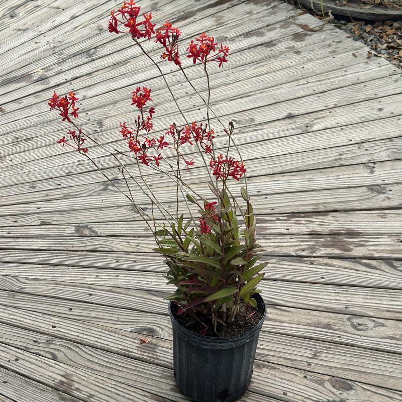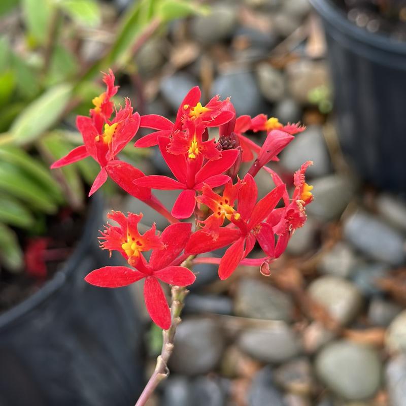 An exotic color for the reed orchid, the lovely red blooms are bright and cheery in shady areas.