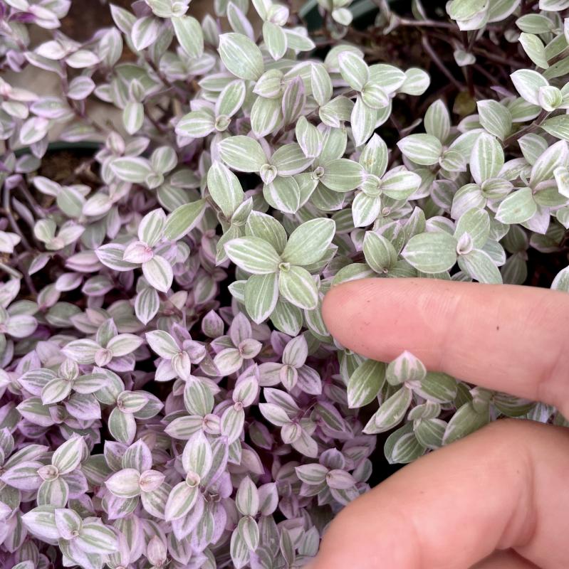 Beautiful, tiny, striped, lavender- and mint-colored leaves cascade delightfully out of a pot or basket. The colorful plant is succulent-like and does best in shallow pots with very well-draining soil. At full maturity, this plant can reach a couple of feet long.