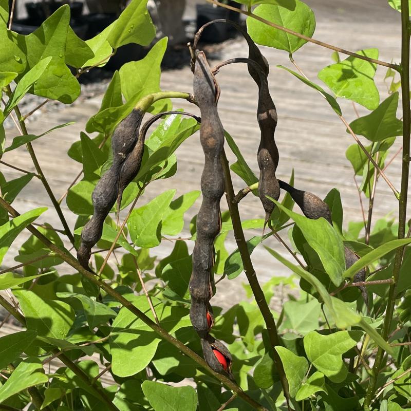 Coral bean is a native plant. Red tubular flowers grow on tall stalks in the spring, drawing hummingbirds and butterflies. In the fall, as the rest of the summer garden starts to fade, coral bean's seed pods begin to mature and the show begins.