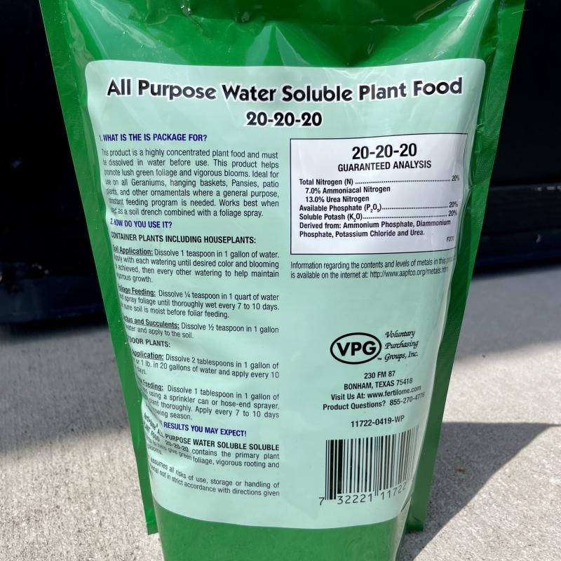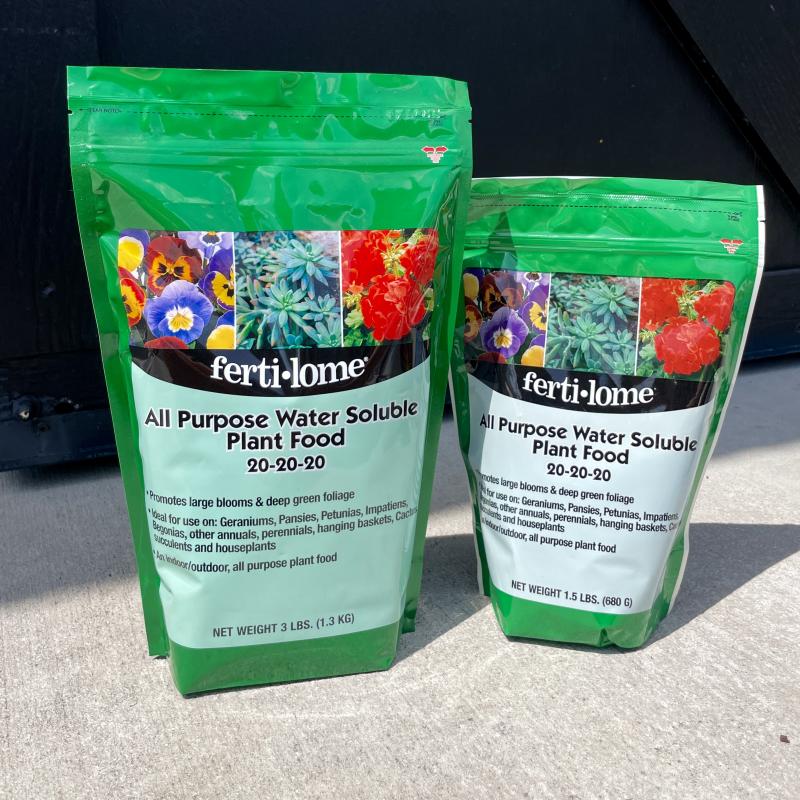 Fertilome All Purpose Water Soluble Plant Food is ideal for all potted (indoor and outdoor) and in-ground plants. Dilute and use as a soil drench combined with a foliar spray. Apply at every watering or every 3 to 4 days. Promotes larger blooms and deeper green foliage.