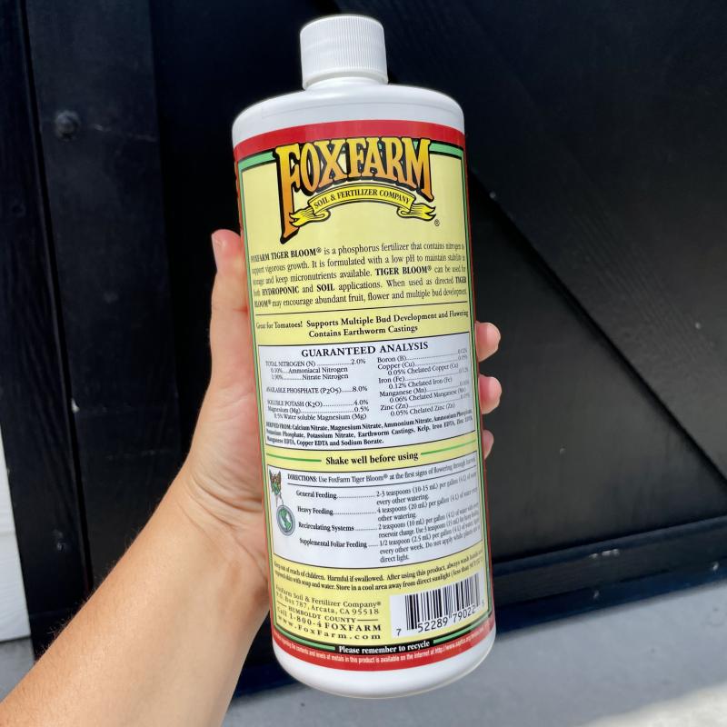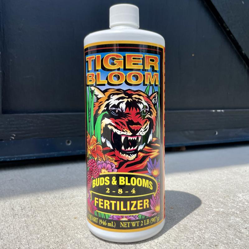 Tiger Bloom is a liquid phosphorus fertilizer that contains nitrogen to support vigorous growth. Use in both hydroponic and soil applications. It's also a great foliar fertilizer — dilute in water and spray the entire leaf in the early morning. Overall, it's designed to encourage abundant fruit, flowers, and multiple bud development. Use at the first signs of flowering and through harvest.